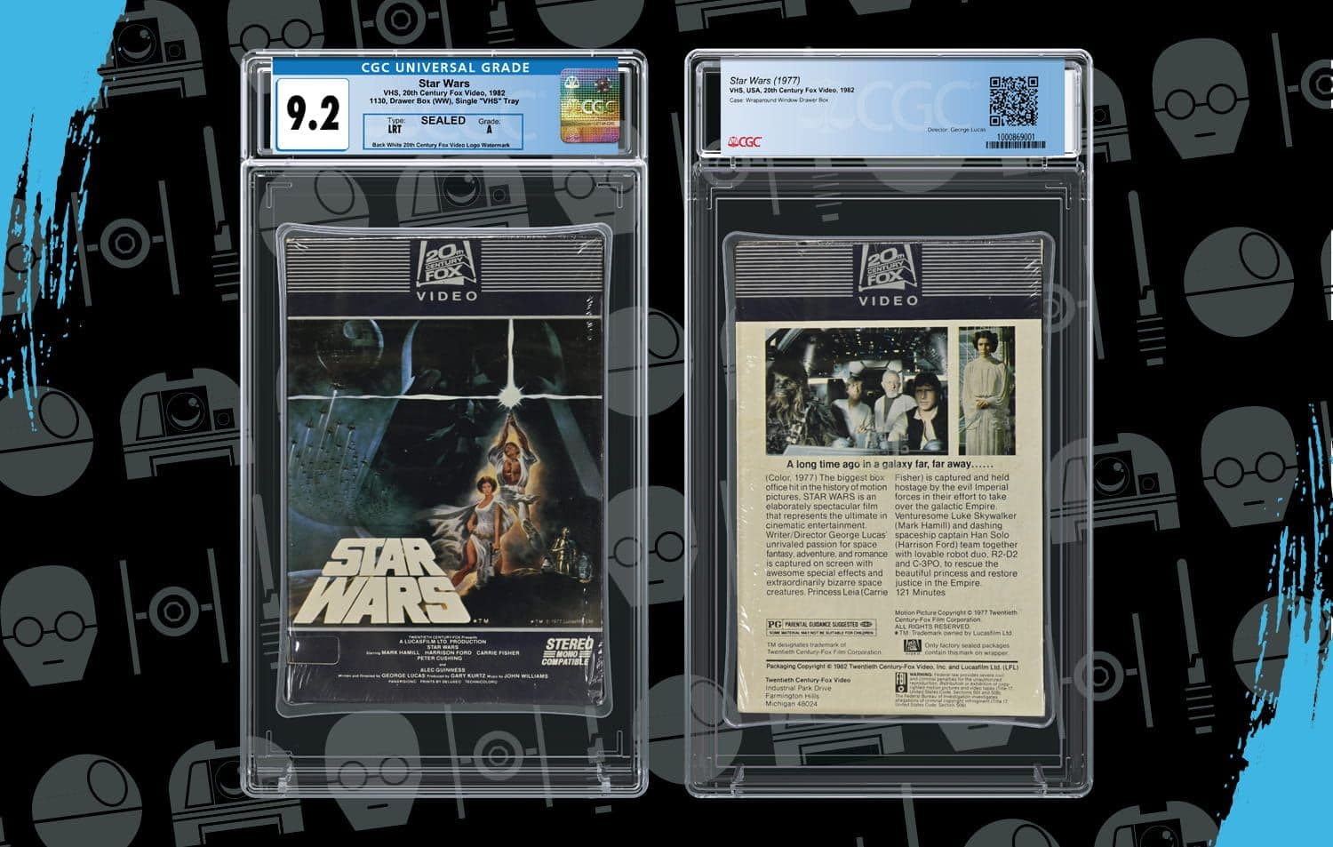 The sealed Star Wars VHS from 20th Century Fox Video (1982) graded CGC 9.2 A (lot 89039) realized $23,750 in the sale. It is one of only two drawer-box VHS copies of the beloved space drama graded by CGC Home Video, as of June 2024. It is believed that there are fewer than ten surviving sealed copies in existence due to low production, according to the auction house, making it one of the rarest Star Wars collectibles in the world.