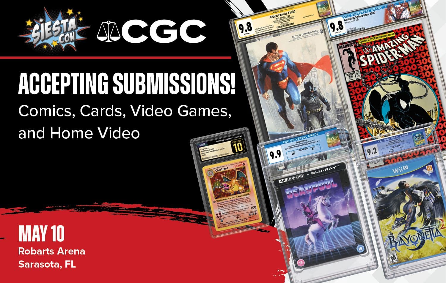 Certified Guaranty Company® (CGC®) is looking forward to accepting submissions of comics, magazines, TCGs, sports cards, non-sports cards, video games and home video collectibles at SiestaCon at Robarts Arena, in Sarasota, Florida, on May 10, 2025.