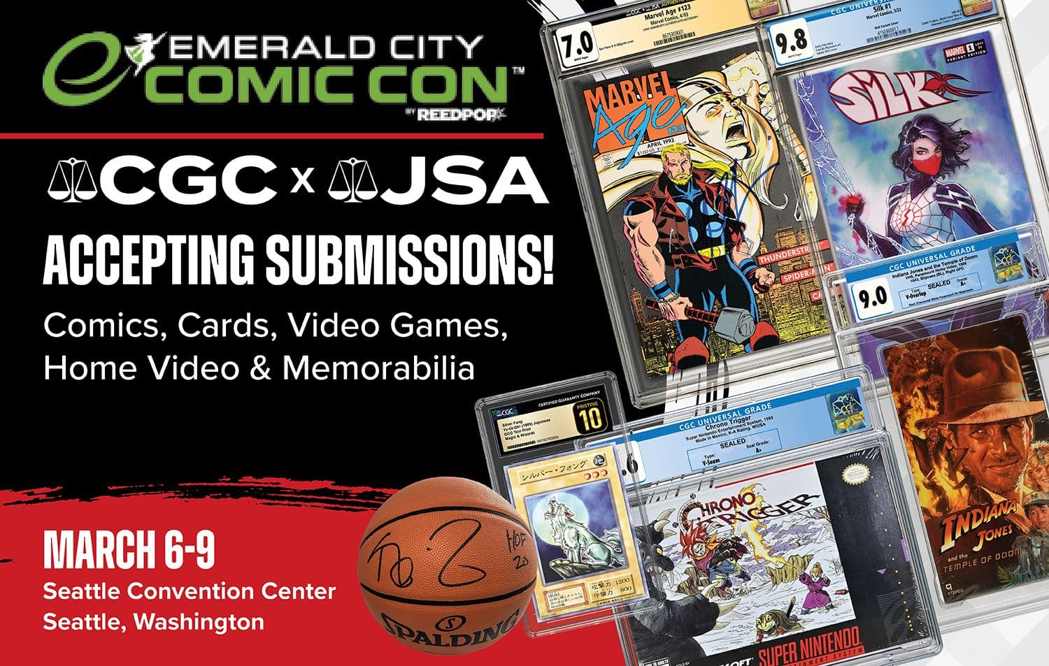 CGC® and JSA® are excited to be accepting submissions at Emerald City Comic Con at the Seattle Convention Center in Seattle, Washington, on March 6-9, 2025.