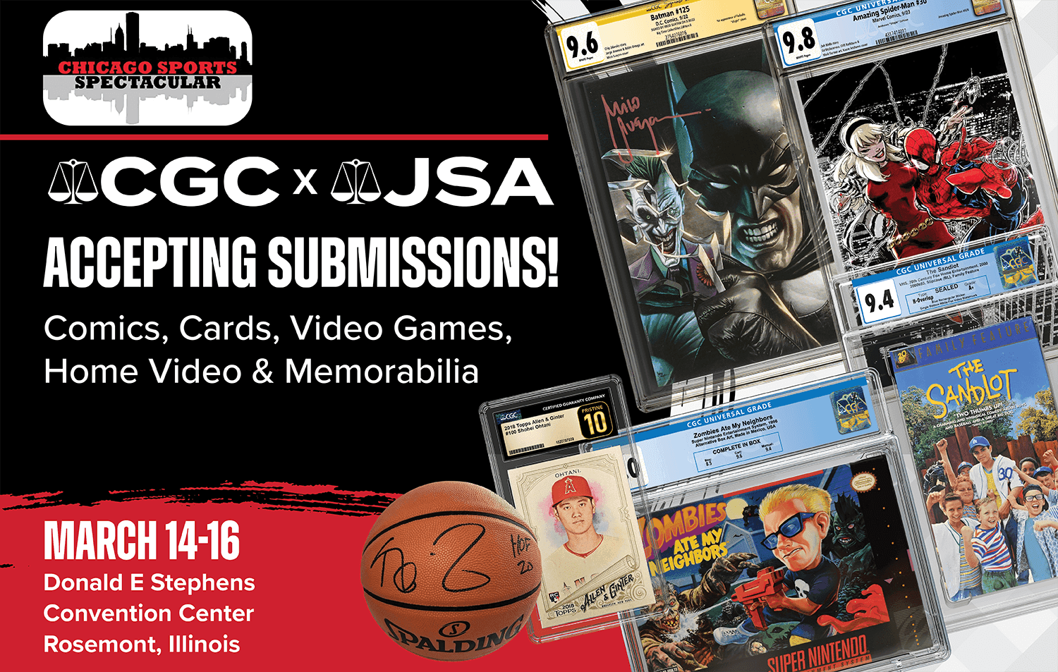 CGC® and JSA® are excited to be accepting submissions for authentication and grading at the Chicago Sports Spectacular at the Donald E Stephens Convention Center in Rosemont, Illinois, on March 14-16, 2025.