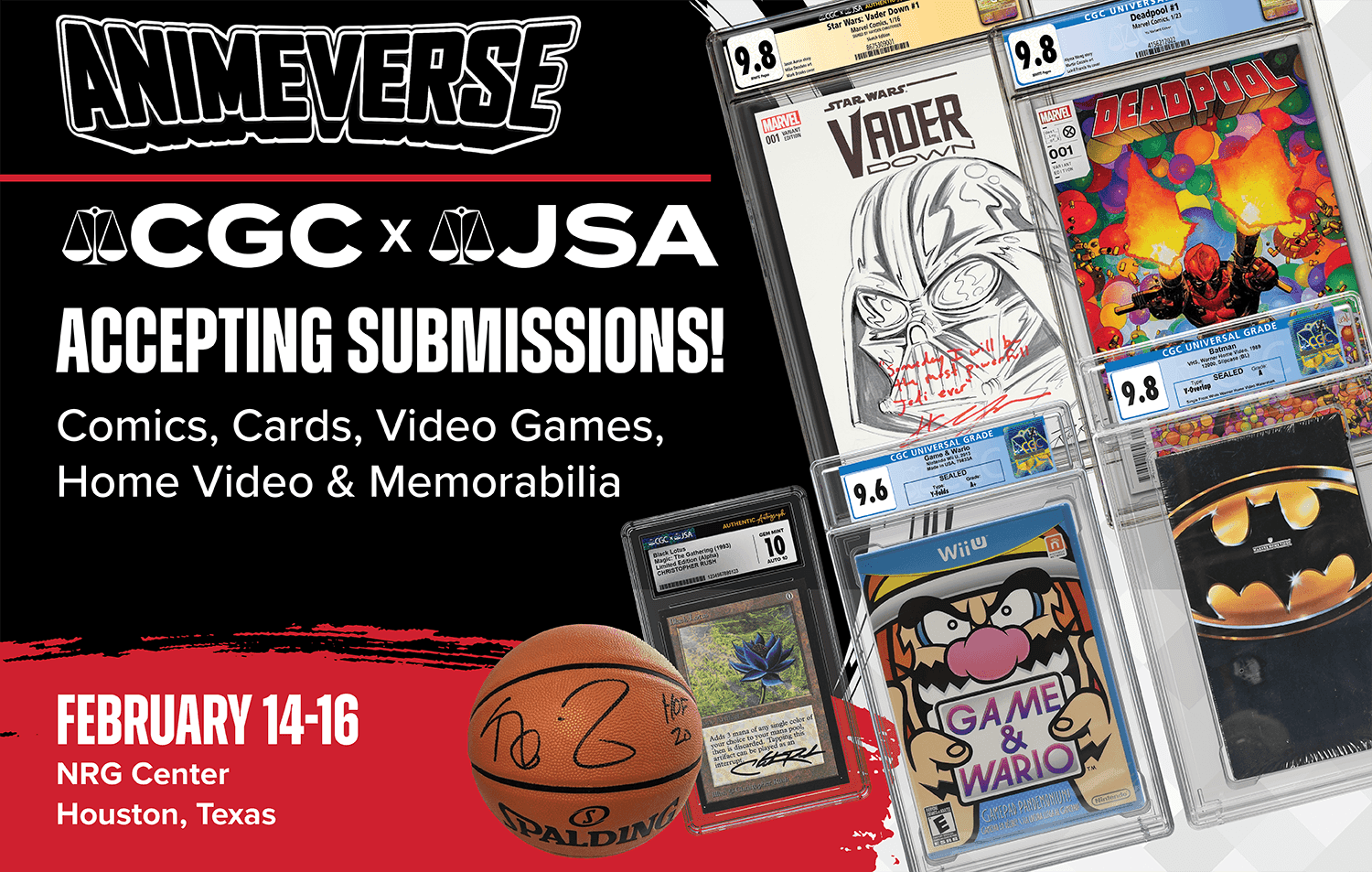 CGC® and JSA® are excited to be accepting submissions of comic books, cards, video games, home video collectibles and memorabilia at AnimeVerse, being held at the NRG Center in Houston, Texas, on February 14-16, 2025.