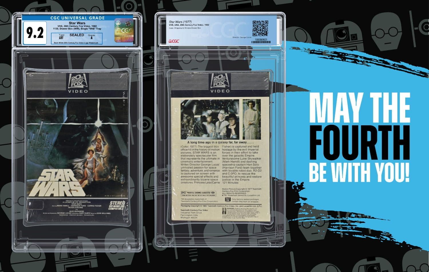 The sealed Star Wars VHS from 20th Century Fox Video (1982) is graded CGC 9.2 A and is one of the rarest Star Wars collectibles in the world. It is believed that there are less than ten factory-sealed drawer box copies of Star Wars still in existence due to low production, according to the auction house.