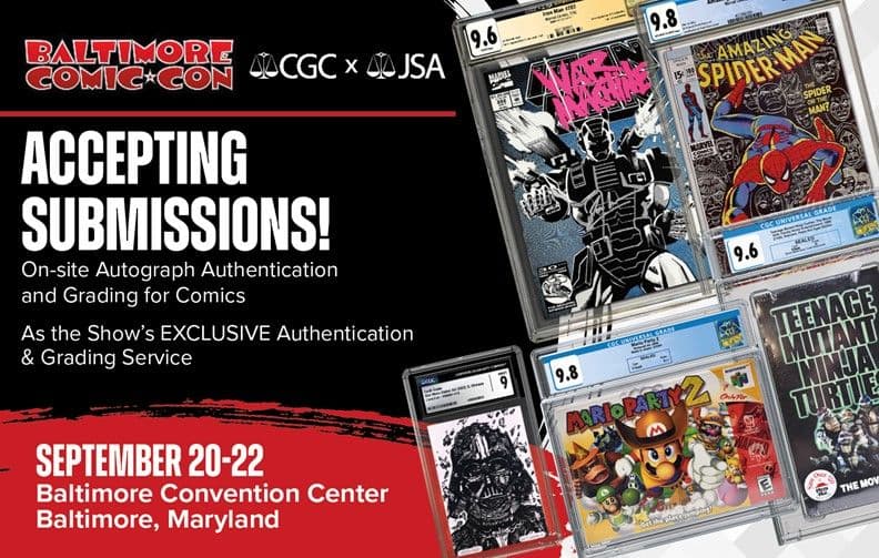 Certified Guaranty Company® (CGC®) and James Spence Authentication® (JSA®) are excited to announce that the companies will be offering on-site autograph authentication and grading for comics as the Official Authentication and Grading Service of Baltimore Comic-Con. This year’s convention will be September 20-22, 2024, at the Inner Harbor’s Baltimore Convention Center.