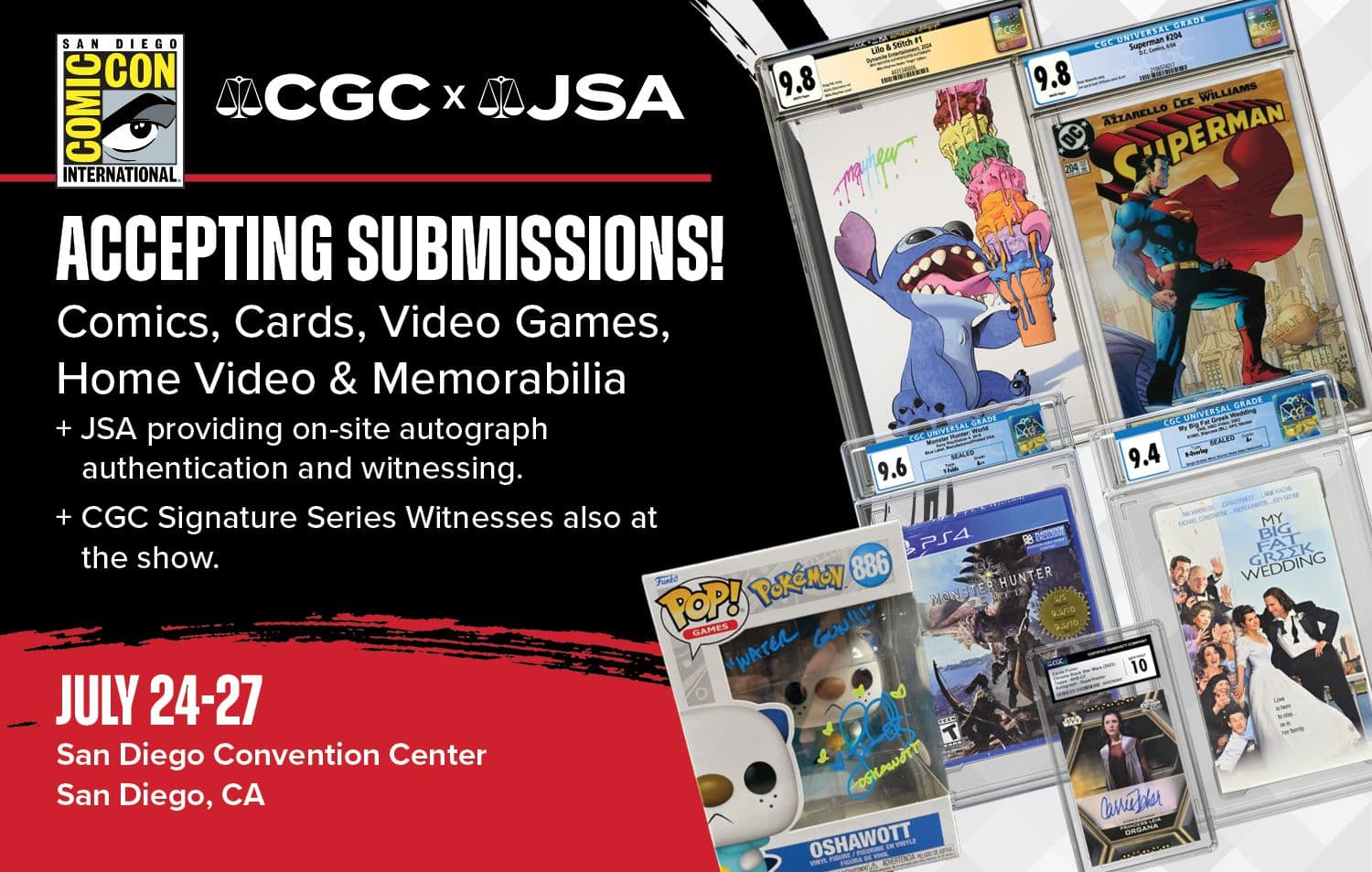 CGC® and JSA® are excited to be accepting submissions at San Diego Comic-Con at the San Diego Convention Center, in San Diego, California, on July 24-27, 2025.