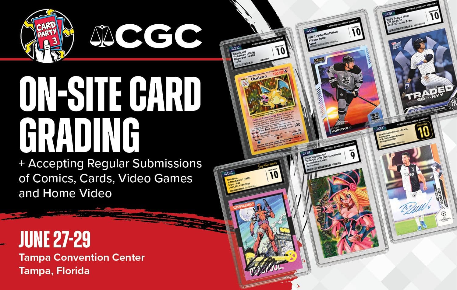 CGC® is thrilled to offer on-site grading at Card Party East, happening at the Tampa Convention Center in Tampa, Florida on June 27-29, 2025. Get your TCGs, sports cards and non-sports cards graded and returned by the end of the show! CGC will also be accepting regular submissions of comics, cards, video games and home video collectibles. Plus, there will be giveaways and swag, so be sure to stop by!