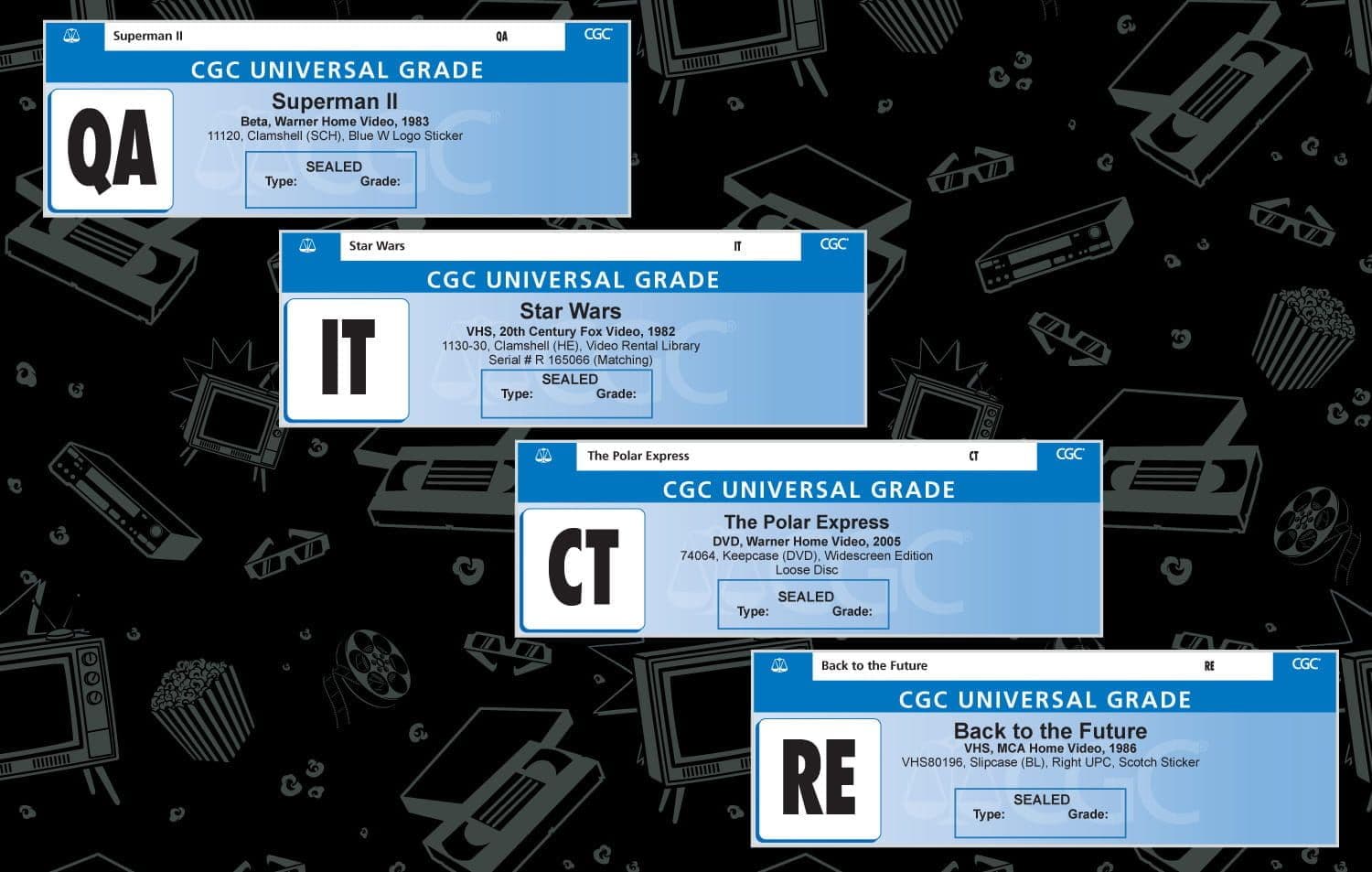 Home video collectibles that do not meet CGC Home Video's authentication standards or are uncertifiable for another reason will be rejected and returned to the submitter "raw" (unencapsulated) with one of four rejection labels: CT, RE, IT or QA.